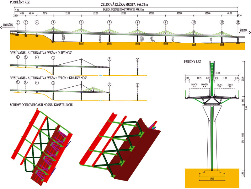 Ako som spomenul v opise návrhu Mestskej estakády v DÚR, jedným zo základných predpokladov koncepcie mosta bola realizácia nosnej konštrukcie technológiou vysúvania. Túto myšlienku sme preto opätovne rozvíjali počas prípravy alternatívneho návrhu mosta v rámci tendrového konania. Vysúvať konštrukciu s rozpätím poľa 122 m má však svoje materiálové limity. A keďže sme zavrhli variant s pomocnými podperami (bolo by ich nutné umiestniť na križovatku a takisto do toku Váhu a ich konštrukcia pri výške až 35 m by bola veľmi nákladná), do úvahy prichádzala iba oceľová konštrukcia, resp. spriahnutá konštrukcia (oceľové hlavné nosníky, betónová mostovka). Vysoká cena oceľovej ortotropnej mostovky však definitívny výber spriahnutej nosnej konštrukcie uľahčila.