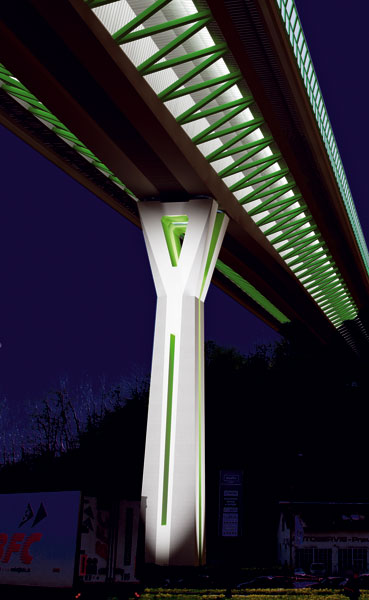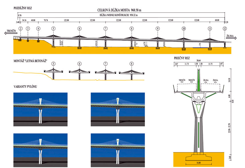 Nosná konštrukcia v tomto variante riešenia mala byť zavesená na 7 pylónoch s výškou 20 m prostredníctvom systému závesov, ktoré by boli umiestnené v osi mosta. Spodnú časť pylónov mal tvoriť oceľový plášť spriahnutý s betónovou výplňou, v hornej časti mala byť oceľová skriňa s ukotvenými závesmi. Výška pylónu mala zabezpečiť efektivitu vyvesenia a ovplyvniť aj výsledný „dizajn“ mosta. Po oboch stranách mosta sú totiž protihlukové steny, a pylóny s vejárom závesov ako dominantné pohľadové prvky mosta sa preto za nimi nesmú strácať. Spodnú stavbu mosta by tvorili štíhle elegantné podpery, ktorých tvarovanie by vyniklo predovšetkým pri večernom osvetlení (obr. 1).
