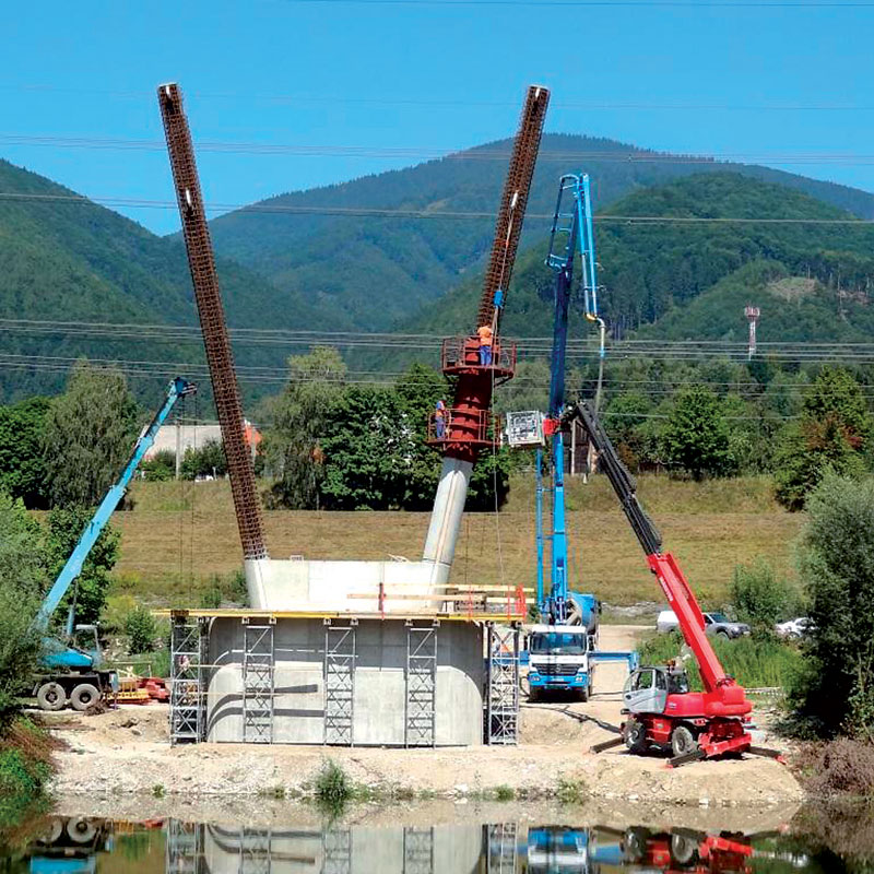 Súčasne s výstavbou opôr prebiehala výstavba pylónov. Po vybudovaní základovej dosky a drieku pylónu, do ktorých sa zabetónoval oceľový priehradový kotevný blok ako zárodok na prichytenie oceľovej stojky pylónov, nasledovala montáž týchto stĺpov (stojok). Stabilitu a prenos zaťažovacích účinkov kotevného bloku do základov zabezpečujú kotevné tyče a mäkká výstuž.