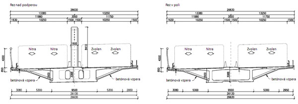 V priečnom reze ide o dvojtrámovú – jednokomorovú konštrukciu vysokú 2,9 m, ktorú vytvára jadro prierezu s obojstrannými železobetónovými prefabrikovanými vzperami, ktoré sú dodatočne zmonolitnené s jadrom prierezu. Celková šírka prierezu je 26,13 m.