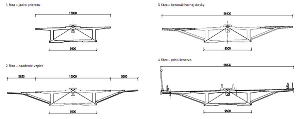 V priečnom smere sa nosná konštrukcia buduje po etapách. Najskôr sa vyhotoví jadro prierezu kombináciou betonáže na podpornej skruži, resp. letmou betonážou. V druhej etape sa na jadro na obidvoch stranách osadia prefabrikované vzpery a následne sa dobuduje monolitická spriahnutá časť mostovkovej dosky.