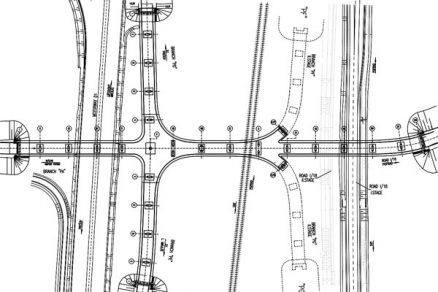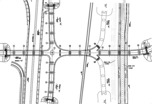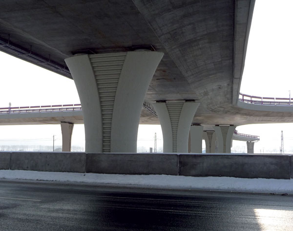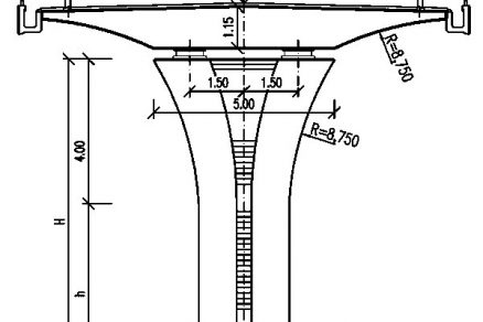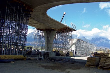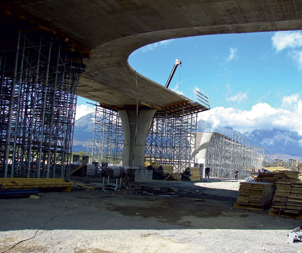 Na vytýčenie pomerne zložitého tvaru nosnej konštrukcie sa vypracoval samostatný výkres a textová príloha so súradnicami vytyčovacích bodov. V najkomplikovanejšej časti nosnej konštrukcie 1. etapy sa súradnicami podrobne zdokumentovali lomy a riadiace priamky potrebné na vytýčenie horného a spodného povrchu nosnej konštrukcie. Návrhom nábehu NK nad podperou č. 6 a umiestnením skrytého priečnika z betonárskej výstuže v asymetrickej časti NK medzi podperami č. 7 vetvy PA a č. 5 vetvy PD, resp. PE sa dosiahlo zmiernenie nepriaznivých účinkov vplyvom zaťaženia na tejto tvarovo a staticky náročnej časti NK (obr. 14). Po vyhotovení spodnej stavby sa postupne v jednotlivých etapách na pevnej podpernej skruži systémom pole, resp. dve polia a konzola vybudovala nosná konštrukcia (obr. 15 až 17).