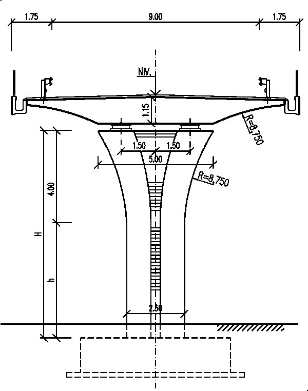 Nosná konštrukcia (NK) sa navrhla ako plná spojitá doska pozostávajúca z dvoch dilatačných celkov, ktoré sú nad spoločnou podperou spojené prostredníctvom mostného dilatačného záveru. Šírka nosnej konštrukcie je na vetvách PA, PD a PE konštantná 11,2 m s konzolami šírky 3,1 m, ktorých spodná hrana má nábeh na kruh s polomerom R = 8,75 m. Výška nosnej konštrukcie je konštantná 1,15 m, len nad podperou č. 6 v mieste napojenia vetiev PD a PE na vetvu PA má nábeh v tvare lievika, ktorého priemer je 16 m a výška nad podperou je 2,15 m (obr. 13).