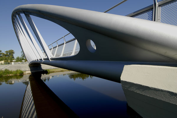 Konštrukciu lávky tvorí sklonený oblúk votknutý do oceľobetónovej mostovky. Sklonenie oblúka a hmotnosť mostovky sú navrhnuté tak, aby sa od stáleho zaťaženia konštrukcia nekrútila. Rozpätie oblúka je 53,200 m, vzopätie 8 000 m. Oblúk tvorí oceľová rúra priemeru 355,6 mm; mostovku tvoria dve okrajové oceľové rúry priemeru 508 a 355,6 mm, ktoré sú navzájom spojené rovinnou priehradou. Diagonály priehrady majú I-prierez. Oceľové rúry a horné pásnice diagonál sú spriahnuté s mostovkou z vysokopevnostného betónu. Torzná pevnosť mostovky je tak daná nielen pevnosťou oboch rúr, ale celým systémom tvoreným rúrami spojenými spodnými pásnicami diagonál a betónovou mostovkovou doskou.