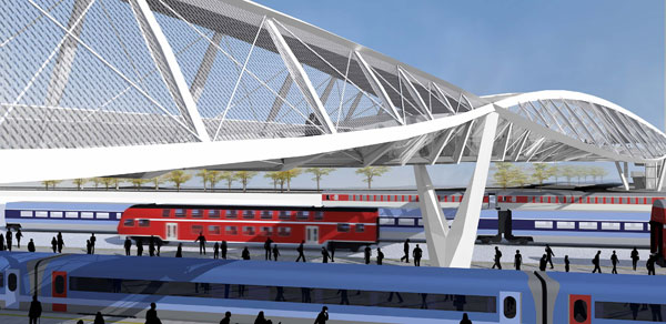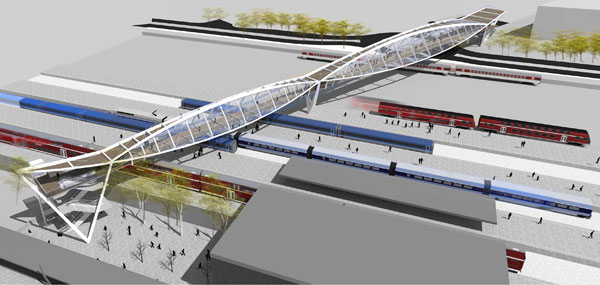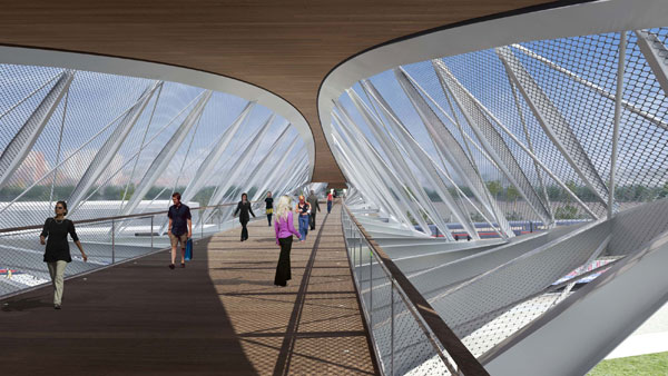 V návrhu autori prepojili univerzitu s budúcou hi-tech priemyselnou zónou. Perforovaný oceľový obklad zabezpečuje chodcom dostatočné tienenie v drsnej púštnej klíme.Rozpätie mosta, ktorý sa klenie ponad mestskú vlakovú stanicu, je 180 metrov. Konštrukcia v tvare krivky je podopretá v troch bodoch. Táto myšlienka vychádza z tradičného navrhovania mostov. Zvlnenie krivky je pomerne nízke, najmä z dôvodu výškového limitu nad železnicou. Na spevnenie konštrukcie pridali architekti ďalšiu krivku v opačnom smere. Tým vytvorili tvar dvoch očí na oboch stranách pešej trasy. Odolnosť proti horizontálnym silám zabezpečili prepojením kriviek. Výsledkom je veľmi dynamický tvar, ktorý sa pri pešom pohybe neustále mení.
