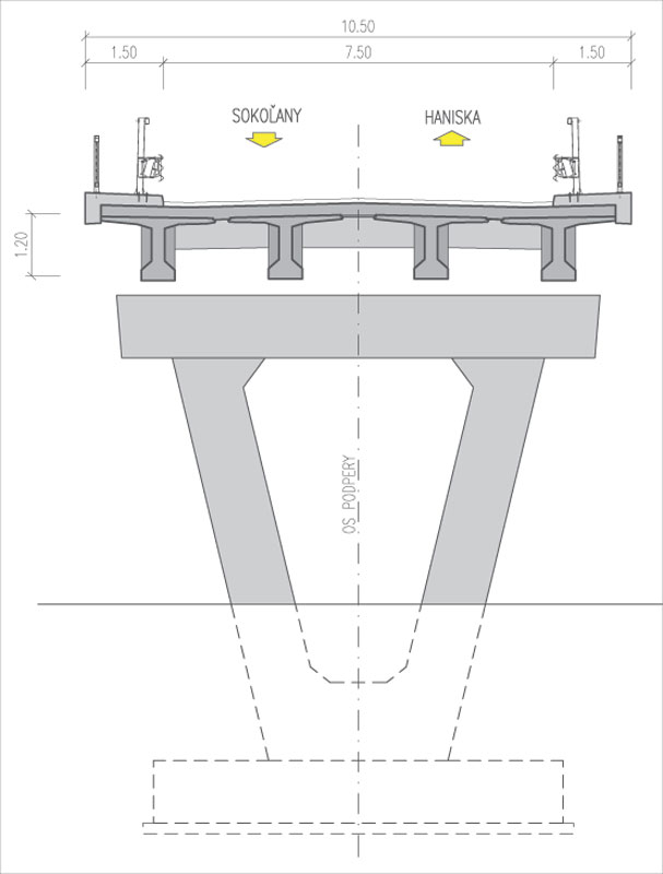 Tyčové prefabrikáty s koncovými priečnikmi sú spriahnuté monolitickou doskou s priemernou hrúbkou 220 mm. Nosníky sú nad medziľahlou podperou spojené bezdilatačným stykom. V pozdĺžnom smere tak vytvárajú dve prosté polia. Nosníky sú uložené priamo na elastomérové ložiská.