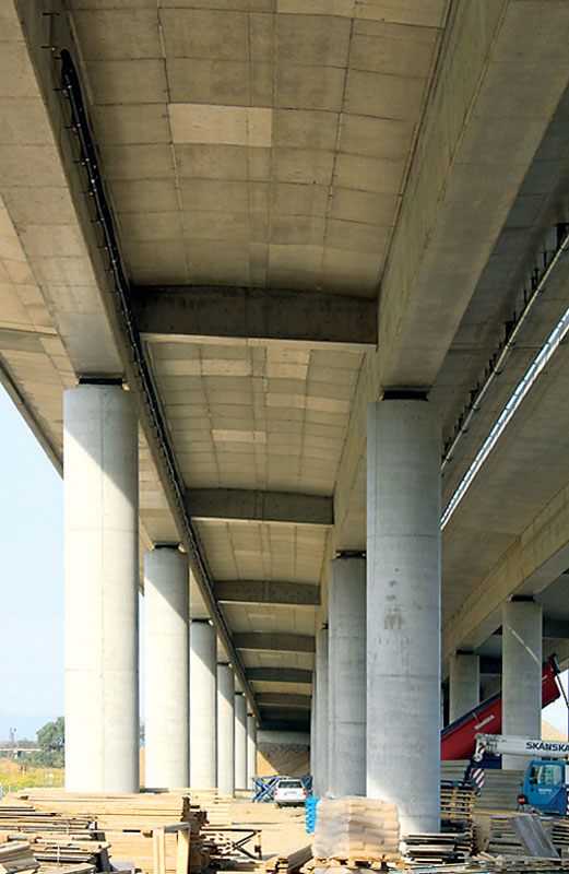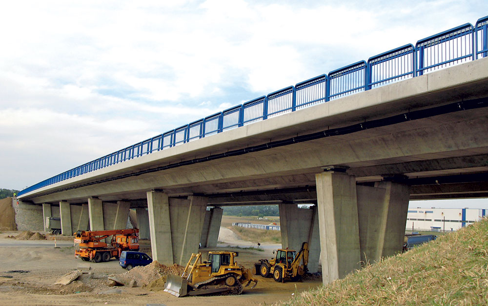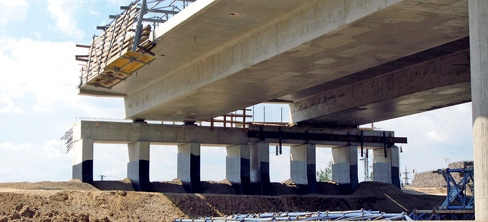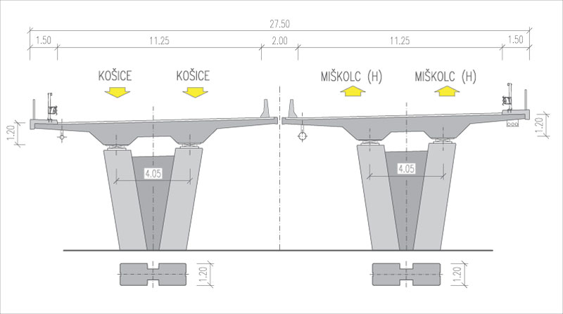 Výstavba nosnej konštrukcie prebiehala technológiou betonáže na podpernej skruži vo dvoch etapách, pričom v prvej etape sa vybudovala nosná konštrukcia v stredných dvoch poliach s previslou konzolou s dĺžkou 5,0 m a v druhej etape v zostávajúcich poliach. Spodnú stavbu pravého aj ľavého mosta tvorí dvojica opôr a päť medziľahlých podpier.