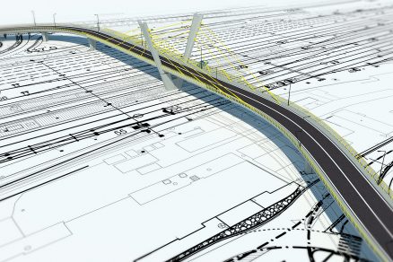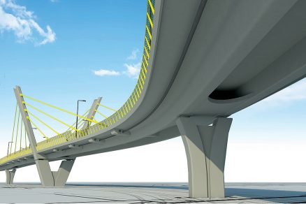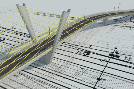 Všetky podstatné stavebné časti mosta sa vzhľadom na komplikovanú geometriu spodnej aj hornej stavby vytvorili v 3D prostredí a premietli do 2D výkresovej časti dokumentácie. Zvládnutie projektových prác v trojrozmernom prostredí považujeme za základný level pri systéme projektovania pomocou Building Information Modelling (BIM), ktorým sa bude uberať aj projekcia inžinierskych stavieb, a teda aj mostných objektov. V čase tvorby projektovej dokumentácie sme už mali za sebou pilotný projekt pomocou BIM systému [1]. Tvary spodnej stavby, ako aj pomerne komplikovaný tvar pylónu a závesov sa modelovali v 3D prostredí programu AutoCAD. Na modelovanie samotnej nosnej konštrukcie, ktorej tvar bol zložitý z dôvodu pôdorysného a výškového zakrivenia, preklápania mostovky, rozširovania a zužovania vozovky v oblúkoch a zmeny šírky ríms, sa použila nadstavba pre program AutoCAD so zameraním na modelovanie cestných mostov [2]. Program sa nasadil na projekt a pomocou podpory vývojára sa úspešne použil ako primárny nástroj pri tvorbe modelu nosnej konštrukcie, tvaru predpínacích káblov, ako aj niektorých častí príslušenstva mosta (ložiská, odvodnenie mosta, zábradlie atď.). Následne sa kontrolovala vzájomná geometria spodnej stavby, nosnej konštrukcie a príslušenstva mosta a odhaľovali sa kolízie, ktoré neboli zastihnuté pri tvorbe 2D dokumentácie.