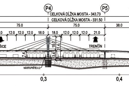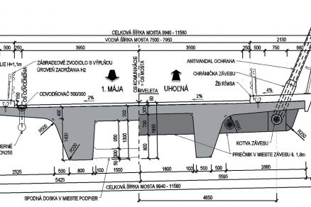 Nosnú konštrukciu bude tvoriť dvojtrámový spojitý nosník z predpätého betónu triedy C 60/75 s rozpätiami polí 36 + 40 + 2 × 75 + 38 + 34 + 32 m, ktorý bude vo svojich dvoch hlavných poliach symetricky zavesený pomocou ôsmich párov závesov cez pylón s výškou cca 27 m nad terénom. Šírka nosnej konštrukcie bude premenná, pretože konštrukcia rešpektuje rozšírenia komunikácie v pôdorysných oblúkoch, ako aj rozšírenia obslužných chodníkov v zavesenej časti mosta. Trámy nosnej konštrukcie budú mať v predpoliach šírku 0,8 m, v zavesených poliach sa na účely vyľahčenia konštrukcie zúžia na 0,5 m (obr. 3). S rovnakým cieľom sa mení aj hrúbka hornej dosky medzi trámami, a to od 0,3 m v zavesenej časti po 0,5 m v predpoliach. Nosná konštrukcia sa nad medziľahlými piliermi opatrí priečnikmi so šírkou 2 m, ako aj spodnou prepojovacou doskou, ktorá bude mať celkovú dĺžku 10 m (symetricky 4 a 4 m od priečnika) a bude ukončená eliptickým nábehom s dĺžkou 3 m. V mieste závesov mosta sa pod konzolami a medzi trámami mosta navrhli priečne rebrá s výškou 0,7 m a šírkou 1,8 m so šikmými bočnými plochami. Každý záves prichádza k nosnej konštrukcii pod iným sklonom, čomu sa podriaďuje sklon bočných plôch v mieste kotvy závesu.