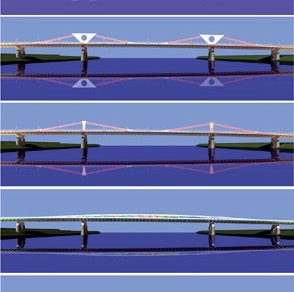 Ďalšie tri študované varianty s pylónmi rôzneho tvaru majú rovnakú koncepciu. Mostovkovú časť tvorí mohutná komora s parapetom, po oboch stranách sú „odvážne“ konzoly so železobetónovou a oceľovou mostovkou. Mostovková časť je v úseku najdlhších stredných polí zavesená na úzkych pylónoch rozličného typu prostredníctvom trojice mohutných káblov.