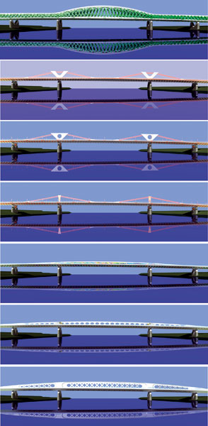 Pre uvedený systém sa navrhli tri varianty s rôznym spôsobom optického aj hmotového odľahčenia rebra – variant grafity, perforované rebro a priehradovina. Pri všetkých troch variantoch je nosné rebro umiestnené v osi mosta, čo vytvára na vozovkovej časti luxusný dopravný priestor, ktorý bude možné v budúcnosti rozličným spôsobom obmieňať. Pri variante graffiti je nosné rebro plné a opticky odľahčené abstraktnou grafikou. Pri variante perforované rebro je hmota tohto nosného prvku odľahčená elipsovitými otvormi. Motív elipsy sa potom opakuje aj v pohľade mosta. Variant priehradovina je akousi spoločenskou objednávkou, pokusom vsunúť do základnej koncepcie s rebrom motív z pôvodného Starého mosta. Bol by však najprácnejší, s veľkým množstvom náročných detailov.