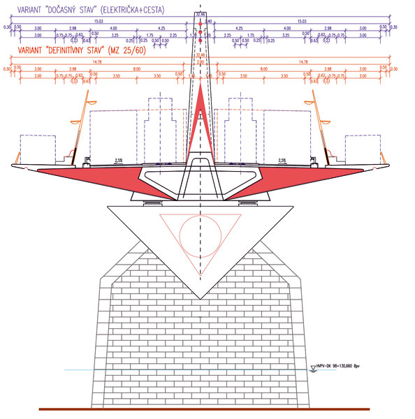 - Keďže spodnú stavbu tvoria podpery sčasti pôvodné alebo nové, vzhľadom na parametre plavebného gabaritu treba aj pri pôvodných podperách zosilniť zakladanie a zväčšiť ich výšku až o približne 3 m. Nadstavenie podpier bude tvoriť rozhranie medzi pôvodnou hmotou podpier (stena so žulovým obkladom) a novou časťou podpery. Bude to rozhranie priznané geometrickým tvarom, materiálom aj povrchovou úpravou „starého“ a „nového“. Pri nových podperách sa tento princíp dodrží použitím pôvodného žulového materiálu z odstránených pôvodných podpier. „Tvar nadstavca“ zohľadňuje statické a technologické požiadavky (vysúvanie nosnej konštrukcie).