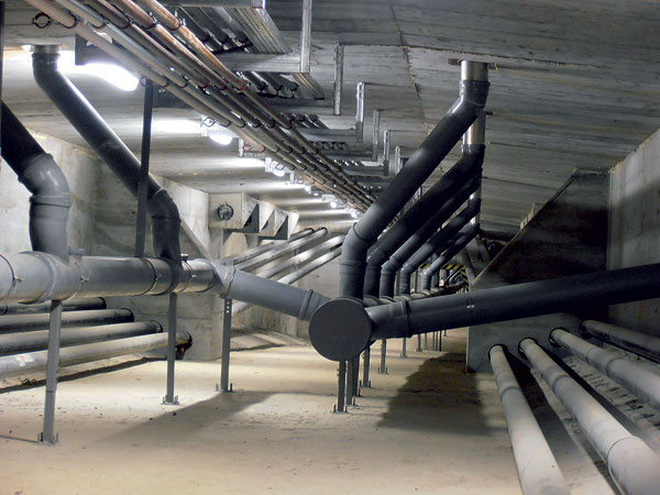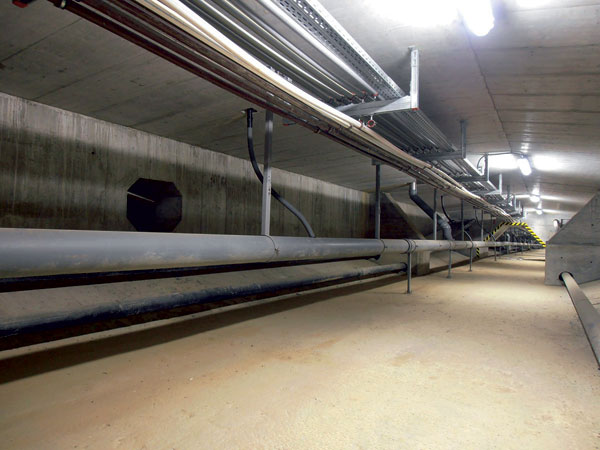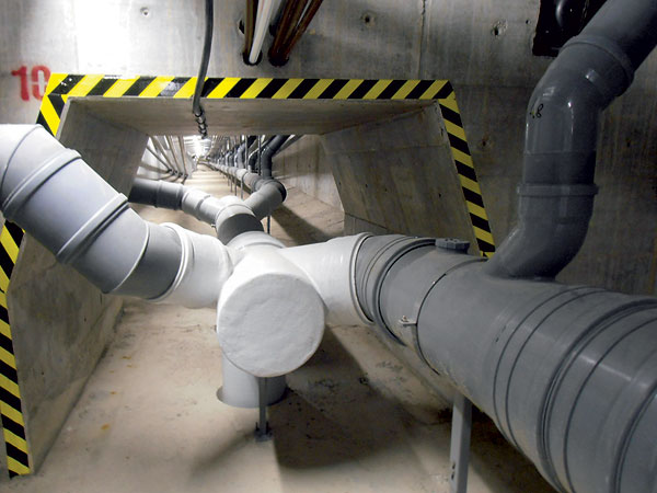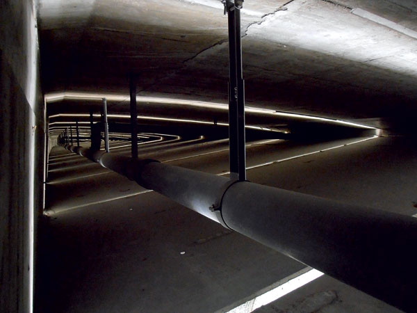 Potrubie sa začína z oboch strán pri oporách a je spádované k osi 10. Hlavné zberné potrubie vedie väčšou strednou komorou. V niektorý častiach sa vedie paralelné zberné potrubie aj v bočných menších komorách, ktoré majú trojuholníkový prierez. Paralelné potrubie vždy vyúsťuje do potrubia v stredovej komore, respektíve vetvy sa zlučujú tesne pred zvodmi.