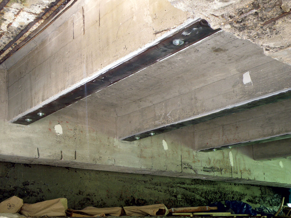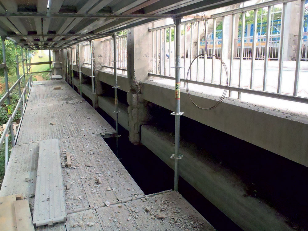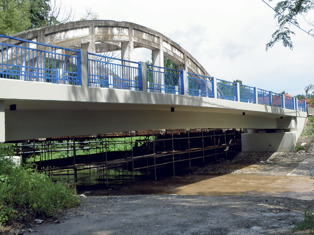 V spodnej časti bolo nevyhnutné sanovať kazetový podhľad mosta (obr. 3), kde sa na nosníky epoxidovým lepidlom lepili oceľové výstužné pásnice. Keďže podklad pod pásnicami musel byť odolný a pevný, aby sa zabezpečil bezproblémový prenos síl, na túto časť sa pre vylepšené vlastnosti zvolili sanačné malty na báze nanotechnológie. Na stužujúce ťahadlá spodnej časti mosta (obr. 4), ktoré boli značne zdegradované, sa zvolila špeciálna tekutá malta, takisto na báze nanotechnológie. Hlavný stavbyvedúci zvolil zaujímavý spôsob jej liatia do debnenia vyhotoveného z polykarbonátových dosiek. Okrem vynikajúcej práce s tekutou opravnou maltou triedy R4 (podľa EN 1504 časť 3), pričom postup prác na stavbe bol naozaj rýchly, bol veľmi zaujímavý aj výsledok (obr. 5). Po oddebnení sa ukázal naozaj zaujímavý vzhľad s otlačeným rastrom povrchu polykarbonátových dosiek. Povrch bol dokonale rovný, bez bubliniek a dutín, s krásnymi ostrými hranami. Keďže ťahadlá mali rovnaké rozmery a opakovali sa na stavbe viackrát, bolo možné vytvoriť formy z polykarbonátových dosiek, ktoré sa použili viacnásobne. V spojení s tekutou maltou a jej rýchlou aplikáciou do debnenia bola sanácia betónu na stavbe naozaj rýchla a s klasickým postupom ručného alebo strojového nanášania malty sa nedá porovnať. Vzhľadom na veľký úspech tohto riešenia sa rovnaký postup použil aj na častiach pozdĺžnych stužujúcich prievlakov v hornej časti nad mostovkou a na zvislých závesoch oblúkov.