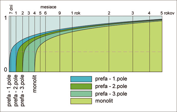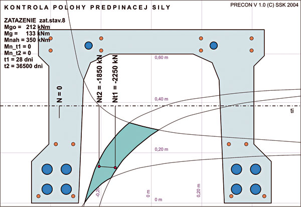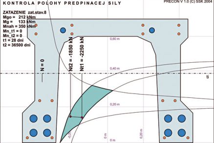 Statický výpočet musel zohľadniť celý rad skutočností súvisiacich s reologickými vlastnosťami betónu, fázami výstavby, viacnásobným predpínaním a statickou neurčitosťou konštrukcie. V súvislosti s premiestňovaním napätí z mladšieho do staršieho betónu sa museli presuny napätia v čase zohľadniť aj pri zmene statickej sústavy v montážnom stave. Jeden z časových scenárov pri výpočte dotvarovania podľa reologických kriviek [4] je na obr. 5. Statické výpočty sa vykonávali za pomoci programov STRAP, POSTTEN a PRECON.