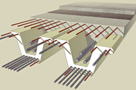 Na základe týchto predpokladov sa odsúhlasilo nasledovné riešenie: V prvej fáze realizácie sa na úložné prahy položia ľahké korýtkové predpäté prefabrikáty, ktoré budú plniť aj funkciu debnenia. Do korýtkových predpätých prefabrikátov sa vleje čerstvý betón a potom sa zmonolitnená sústava predopne ako celok (obr. 6).