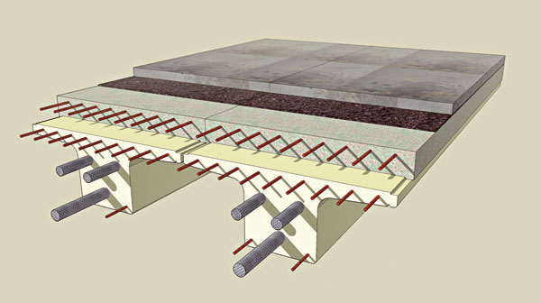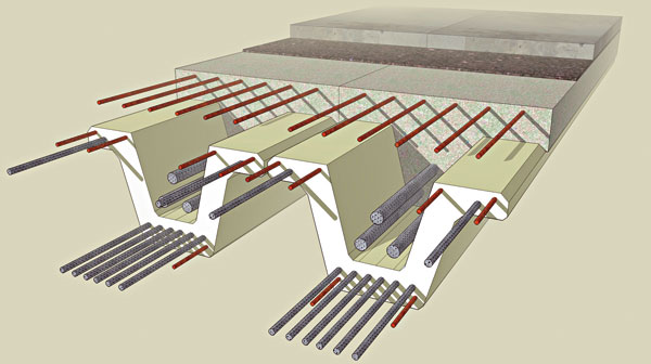 Základná koncepcia výstavby sa oproti prvej verzii nezmenila. Na položené prvofázovo predpäté prefabrikáty sa uložil monolitický betón a priečniky a v druhej fáze sa celá sústava po dosiahnutí požadovanej pevnosti betónu predopla ako spojitý celok. Konštrukčná výška sa v novej koncepcii zvýšila o jeden centimeter na 710 mm. Stredná výška prefabrikátu je 550 mm (obr. 7).
