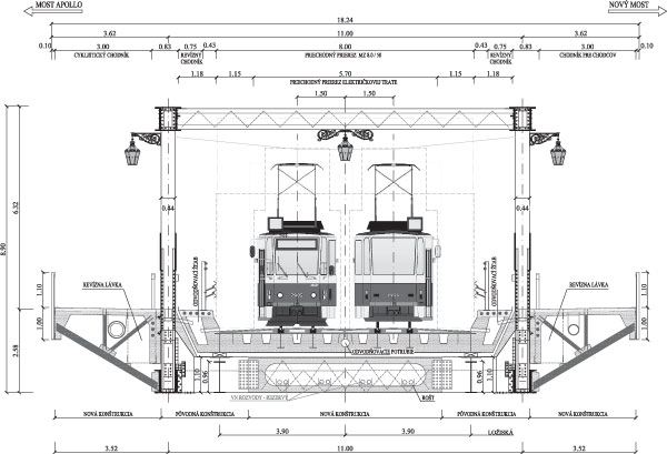 - Kardinálnym problémom rekonštrukcie mosta, ktorá predpokladá použitie hlavných nosníkov existujúceho železničného mosta, bolo vyriešenie problému nedostatočnej rázovej lomovej húževnatosti ocele nosníkov. Tento nevyhovujúci parameter ocele by mohol byť problémový v prípade silného rázu do týchto nosníkov. Takýto zaťažovací stav by mohol nastať v prípade vybočenia električkového alebo cestného vozidla. Z uvedeného dôvodu sa hlavný dôraz pri návrhu konštrukčného riešenia mosta kládol najmä na to, aby sa takémuto zaťaženiu predišlo. Mostovkovú časť mosta bude tvoriť nová konštrukcia (ortotropná oceľová doska), ktorá bude vo vzdialenosti po 8,25 m uložená prostredníctvom elastomerových ložísk na priečniky hlavnej nosnej konštrukcie. Takáto „plávajúca“ mostovka v prípade nárazu vybočeného vozidla utlmí ráz na hlavnú nosnú konštrukciu. Mostovková časť mosta bude mať po oboch stranách vozovky oceľový parapet vysoký 0,60 m a oceľové zvodidlá vysokej triedy zadržania. Tieto opatrenia zabránia v prípade vybočenia vozidla jeho kontaktu s hlavnými nosníkmi konštrukcie.