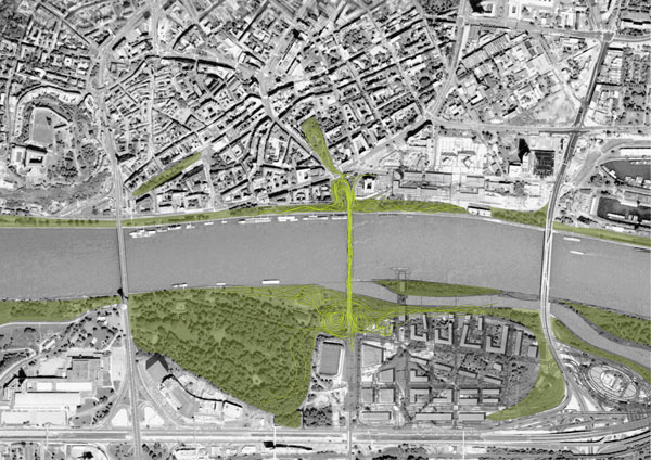 K samotnému neobvyklému návrhu dodali: „Mal by to byť príbeh živého a neustále sa meniaceho organizmu. Most ako kontinuálna časť zelenej krajiny vytvára prepojenie medzi novým lineárnym parkom na ľavom brehu Dunaja a neformálnou zelenou pravou stranou, kde sa napája na hrádzu a Sad Janka Kráľa. Scénický park nie je len spojnicou, ale aj plnohodnotným verejným priestorom, ktorého kompozíciu tvoria mikropriestory individuálneho a intímneho charakteru.“