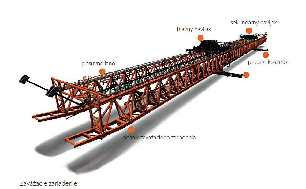 Presun čiastočne predpätých nosníkov z výrobnej linky ku krajnej opore mosta zabezpečujú dva pohyblivé portálové žeriavy na kolesových podvozkoch, každý s nosnosťou 77,5 t. Pohybujú sa synchronizovanou rýchlosťou maximálne 4 km/h a sú schopné prekonať sklon až 8 %. Konečné uloženie nosníkov na piliere zabezpečuje zavážacie zariadenie s dĺžkou 120 m a hmotnosťou 170 t. Zariadenie pracuje veľmi presne a bezpečne. Princíp pohybu je jednoduchý – ukotvené zavážacie zariadenie umožňuje pohyb svojich navijakov s nosníkom pozdĺž zariadenia a po ukotvení navijakov sa následne presúva nosná konštrukcia zavážacieho zariadenia. Týmto spôsobom možno jednotlivé nosníky presunúť z jedného mostného poľa na ďalšie a pomocou valčekov v smere prierezu dostať nosník až na určené ložiská.