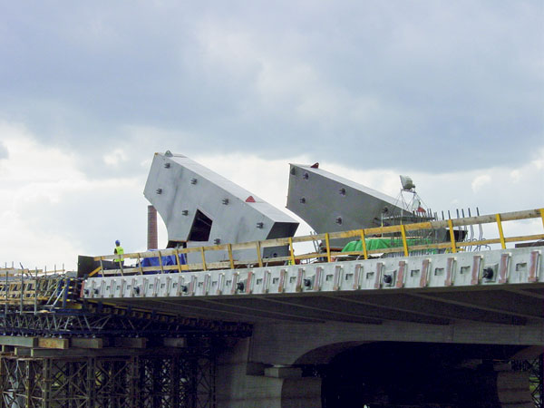 Oceľové ťahadlá a prefabrikované nosníky sa zostavujú na nábreží v Holešoviciach. Keďže most nemá tuhé pozdĺžne časti, treba použiť dočasné oceľové nosníky, pôsobiace ako dvojica tuhých pozdĺžnych nosníkov.