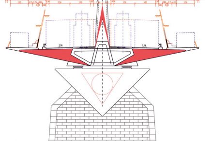 Na pomocnú konštrukciu sa osadil priečny nosník – priečnik. Priečnik sa uložil na lisy s nosnosťou 200 t, ktoré zabezpečovali zmenu priečneho aj pozdĺžneho sklonu. Samotné nosníky skruže sa umiestnili tak, aby ležali na minimálne troch priečnikoch. To umožňovalo plynulú zmenu akéhokoľvek sklonu.