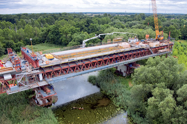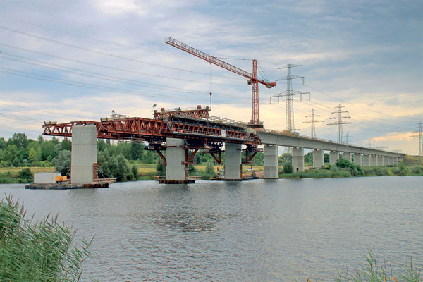 Zákazku realizuje konzorcium firiem Hochtief, Adam Hörnig a Gerdum und Breuer. Kým sa rozvinie prvý ťah železnice, na obrovskom stavebnom poli v tvare Y pracuje súčasne na desiatich miestach asi 110 skúsených betonárov a 30 viazačov. Následne sa jednotlivé zábery mosta bezškárovo spoja do celkovej stavebnej konštrukcie.