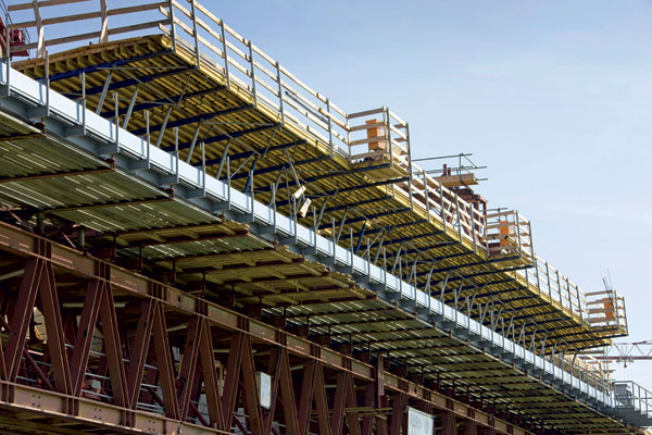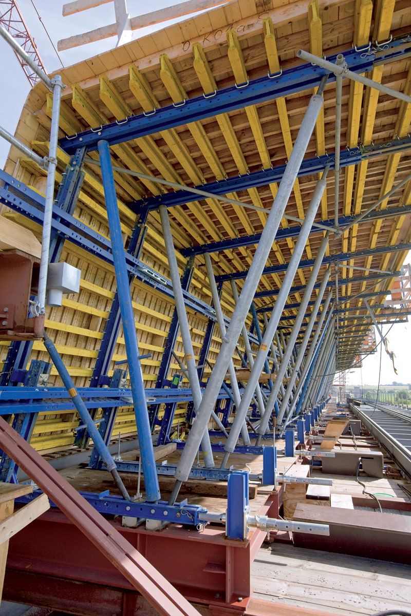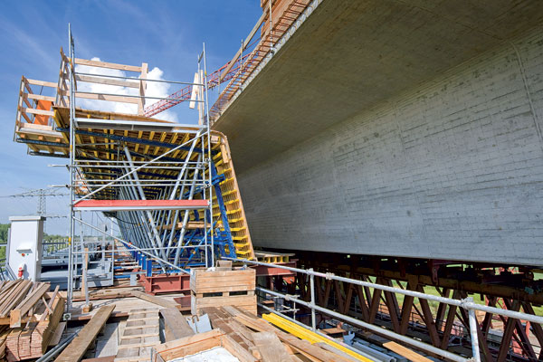 Horná konštrukcia mosta s plochou 117 000 m2 zodpovedá veľkosťou približne 34 futbalovým ihriskám. Nasadené sú súčasne viaceré sady pevnej skruže a dve sady výsuvnej skruže. Na dvoch výsuvných skružiach sa pri tomto projekte použilo 1 400 m2 nosníkového debnenia Top 50.