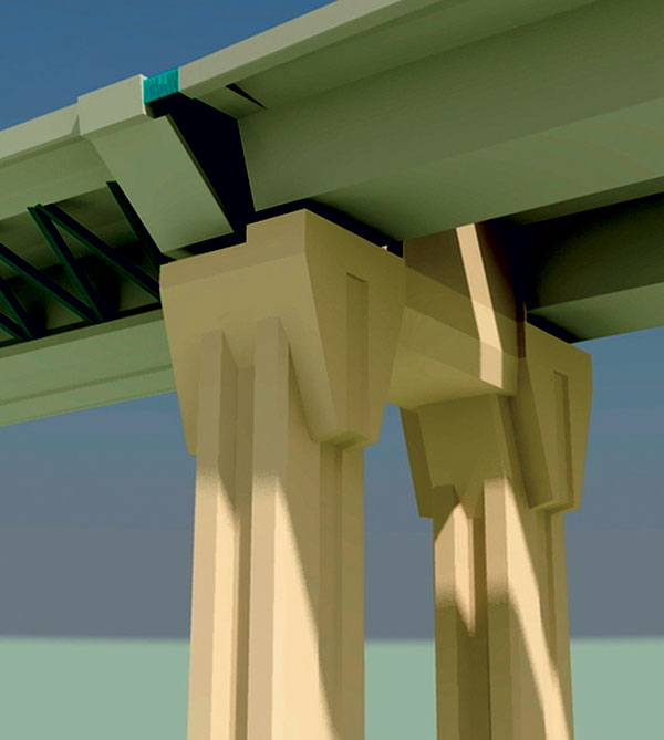 Tvar prechodového piliera (obr. 2) vychádza z tvaru bežných pilierov. Zo spoločného základu vychádzajú dva samostatné drieky, ktoré sú v hornej časti spojené mohutným priečnikom. To umožňuje na pilier