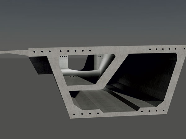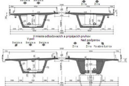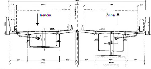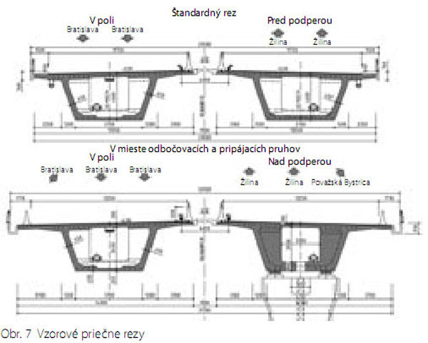 Nosná konštrukcia pravého aj ľavého mosta sa navrhla ako jednokomorový prierez konštantnej výšky 4,0 m so šikmými stenami a vyloženými konzolami (obr. 5 a 6). Šírka nosných konštrukcií hlavných trámov je 14,90 m v mieste, kde sú prípojné a odbočné pruhy, a 13,550 m za rozpletom. Vodorovná spodná doska komory má konštantnú šírku 5,7 m. V mieste odbočujúcich križovatkových vetiev sa z hlavného trámu odpája ich nosná konštrukcia. Odbočenie sa navrhlo prienikom komory hlavného mosta s výškou 4,0 m a komorového prierezu vetvy s výškou 2,4 m. Steny nosnej konštrukcie odbočujúcich vetiev majú premenný sklon, aby plynule nadviazali na tvar susedných objektov križovatkových rámp (obr. 7).