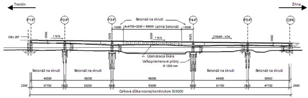 Nosná konštrukcia sa v pozdĺžnom smere navrhla ako obmedzene predpätá, v priečnom smere pôsobí ako železobetónová.