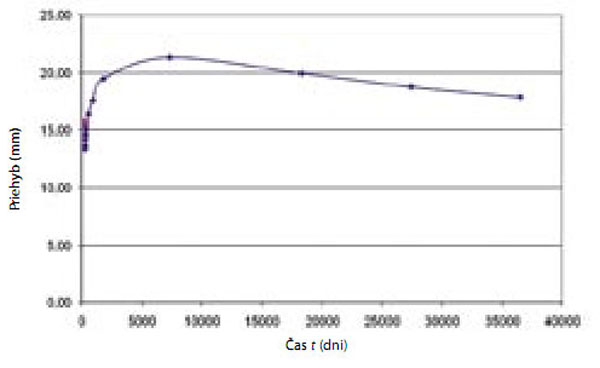 | Obr. 14 Zvislé deformácie letmo betónovanej konzoly vplyvom diferenčného zmrašťovania [3] | Obr. 15 Zvislé deformácie konštrukcie vplyvom diferenčného zmrašťovania po zmonolitnenie konzol [3] |