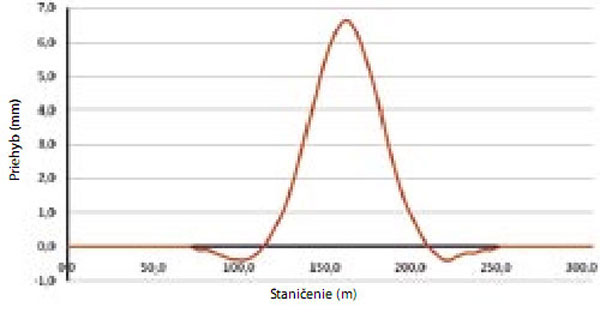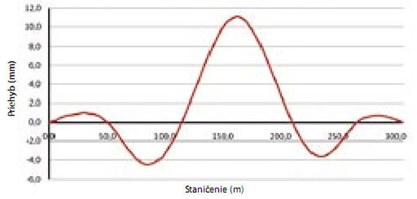 | Obr. 16 Schéma zvislej deformácie pôsobením zdvíhaného kábla spojitosti v hlavnom poli (1 × 19 lán) [4] | Obr. 17 Schéma zvislej deformácie pôsobením kábla spojitosti (1 × 19 lán), tvoreného čiastkovými priamymi káblami v hlavnom poli a nad priľahlými podperami [4] |
