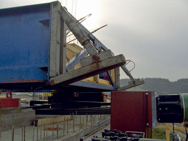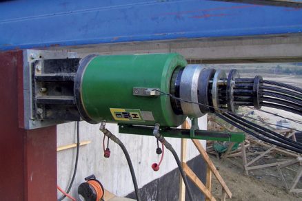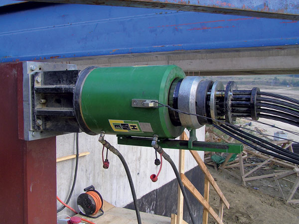 Ťah lana sa do mosta prenášal pomocou oceľových tŕňov profilu I-4 00, zasunutých do vynechaných otvorov v hornej a spodnej doske mosta. Lisy mali zdvih 28 cm, takže po každom posunutí mosta o asi 25 cm nastala krátka prestávka (asi 1 minúta), kým sa hydraulické zdviháky automaticky neprekotvili.