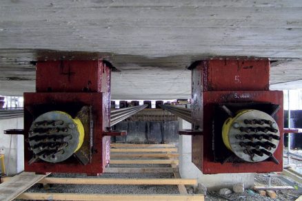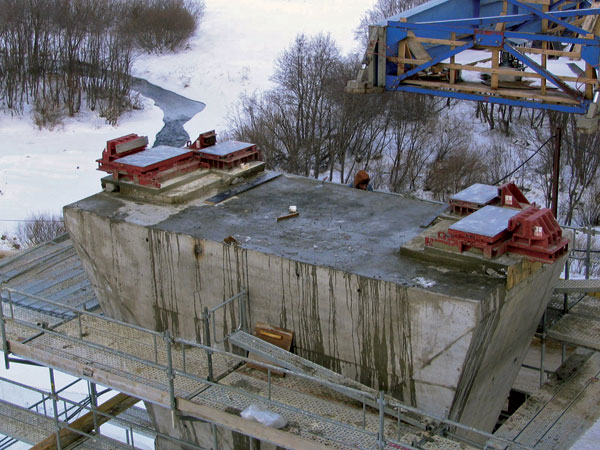 Dôležitou súčasťou pri výmene ložísk bola aj špeciálna podvesená lávka, pomocou ktorej bolo možné dostať lisy na hlavicu piliera a realizovať výmenu dočasných klzných ložísk za ložiská definitívne.