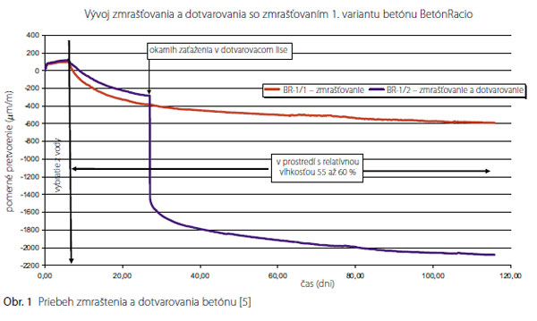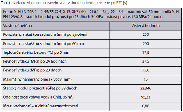 Pôvodným zámerom špecifikácie na základe požiadaviek stavby bolo dosiahnuť pevnosť v tlaku 40 MPa po 24 hodinách. Zloženie betónu z hľadiska základných vlastností bolo pripravené v priebehu októbra 2008, následne sa vyrobili skúšobné telesá na overenie priebehu zmrašťovania a dotvarovania (obr. 1).