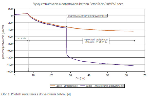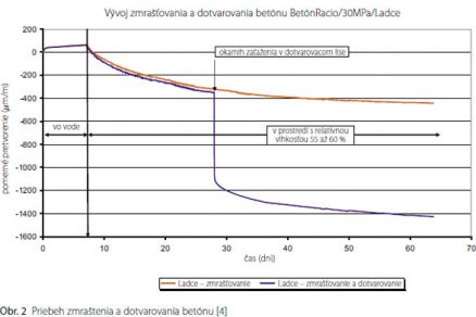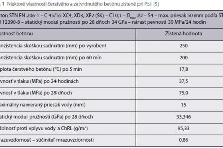 Úprava zloženia betónu s cieľom zabezpečiť nárast pevnosti 30 MPa za 24 hodín mala priaznivý vplyv na priebeh zmrašťovania a dotvarovania (obr. 2) a zároveň prispela aj k zlepšeniu vlastností betónu v čerstvom stave. Po betonáži prvej lamely nosnej konštrukcie mosta bola v jej priereze zistená maximálna teplota 56 °C, čím sa potvrdili predpoklady aj v oblasti priebehu teploty v konštrukcii. Ďalšie vlastnosti betónu z počiatočnej skúšky typu sa uvádzajú v tabuľke.