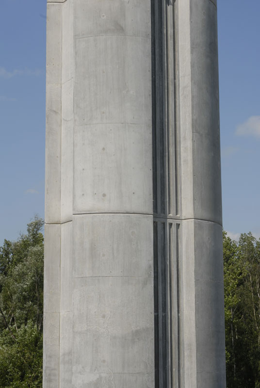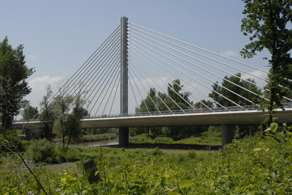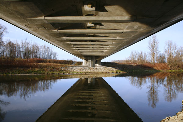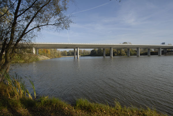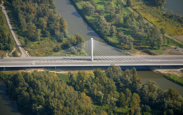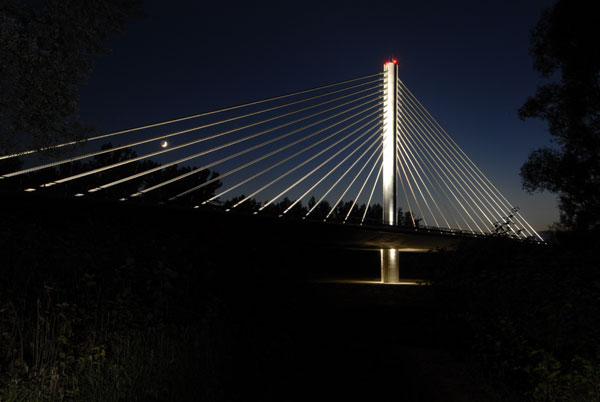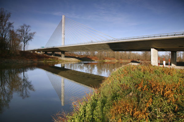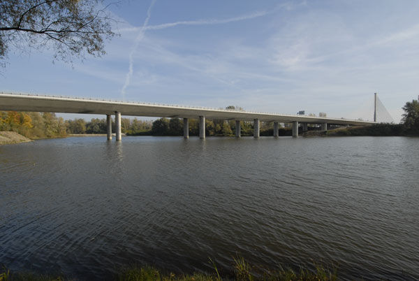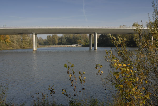 Keďže most je pod rôznym uhlom viditeľný nielen z diaľnice, ale aj z brehov rieky a jazera, bolo snahou navrhnúť jasne čitateľnú konštrukciu. Preto je konštrukcia zavesená v osi mosta na jednostĺpovom pylóne a tak v každom pohľade vytvárajú závesy s mostovkou tvarovo čistú konštrukciu. Mostovka s rímsou, ako aj spodná stavba a pylón majú rovnaké tvarovanie zdôrazňujúce prúdnicový tvar konštrukčných prvkov. Aby mohli byť čo najštíhlejšie, naviac namáhané prvky sú navrhnuté z vysokopevnostného betónu. Keďže osové zavesenie vyžaduje torzne pevnú konštrukciu, mostovka je tvorená dvoma čo najširšími komorovými nosníkmi bez tradičných vonkajších konzol.