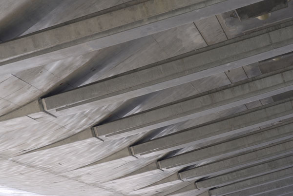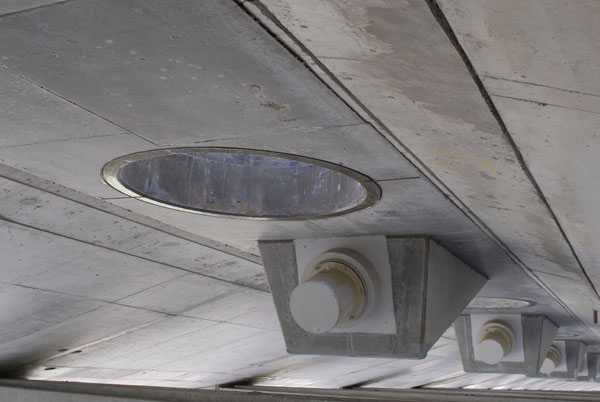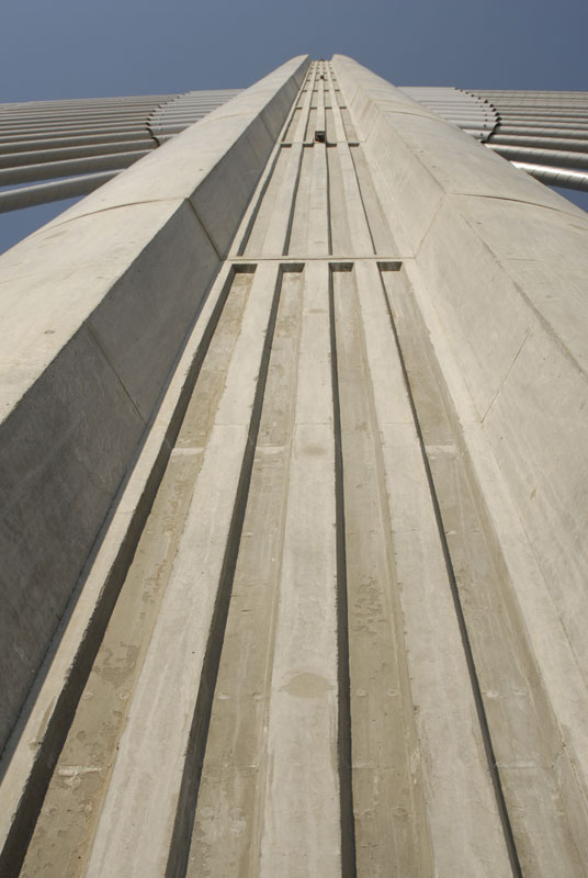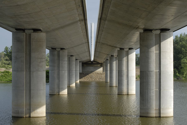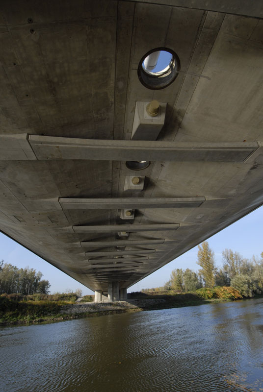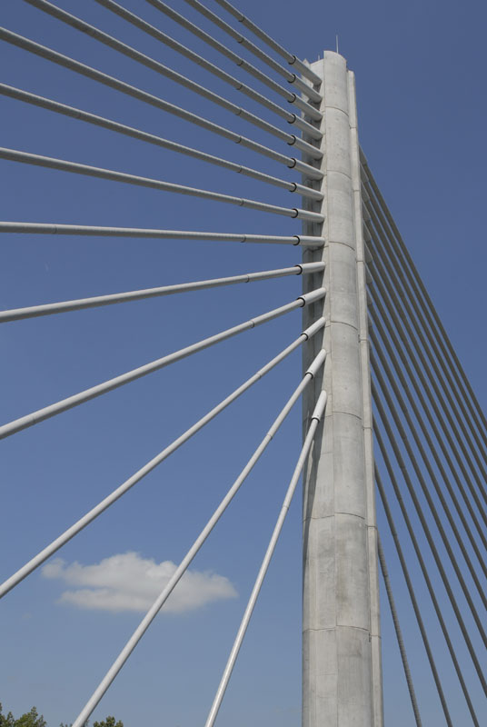 Rozpätie polí je od 24,50 do 105,00 m, šírky oboch mostov sú od 14,60 do 13,60 m. V zavesených poliach sú mosty navzájom spojené priečne predopnutou mostovkovou doskou a osamelými vzperami. Závesné káble majú semi-radiálne usporiadanie. V mostovke sú kotvené po 6,07 m, v pylóne po 1,20 m. Pylón tvorí oceľový stĺp osemuholníkového prierezu spriahnutý s vonkajším betónovým plášťom zaobleného tvaru. V hornej časti oceľovej konštrukcie pylónu sú kotvené závesy, vnútorný priestor oceľovej konštrukcie pod kotvením závesov je vyplnený vysokopevnostným betónom. Na závesy sa použil systém VSL SSI 2000. Závesy sú zostavené z 55 až 91 lán priemeru 15,7 mm a pevnosti 1 860 MPa. Laná sú vybavené tesne extrudovaným HDPE obalom hrúbky 1,5 mm a antikoróznym voskom. Vedené sú v HDPE rúrkach s vonkajším povrchom zabezpečeným šraubovitým nálisom, ktorý počas dažďa zaisťuje odkvapávanie vody a obmedzuje tak kmitanie závesov v dôsledku vetra.