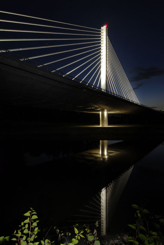 Most kríži rieku pod šikmým uhlom 54°. Os diaľnice vedie v pôdorysnom oblúku v polomere 1 500 m, ktorý v zavesenej časti prechádza v priamu a je vo vrcholovom zakružovacom oblúku s polomerom 20,000 m. Napriek tomu, že zavesená konštrukcia vždy vytvára výraznú dominantu, boli konštrukcia aj jednotlivé konštrukčné prvky navrhnuté tak, aby neprehlušovali, ale dopĺňali krajinu. Návrh konštrukcie vychádzal z projektantovej filozofie jednoty tvaru a funkcie. Úmernosť riešení sa vždy posudzovala ekonomikou spotreby materiálu a práce.Téma mesiaca február: MOSTY