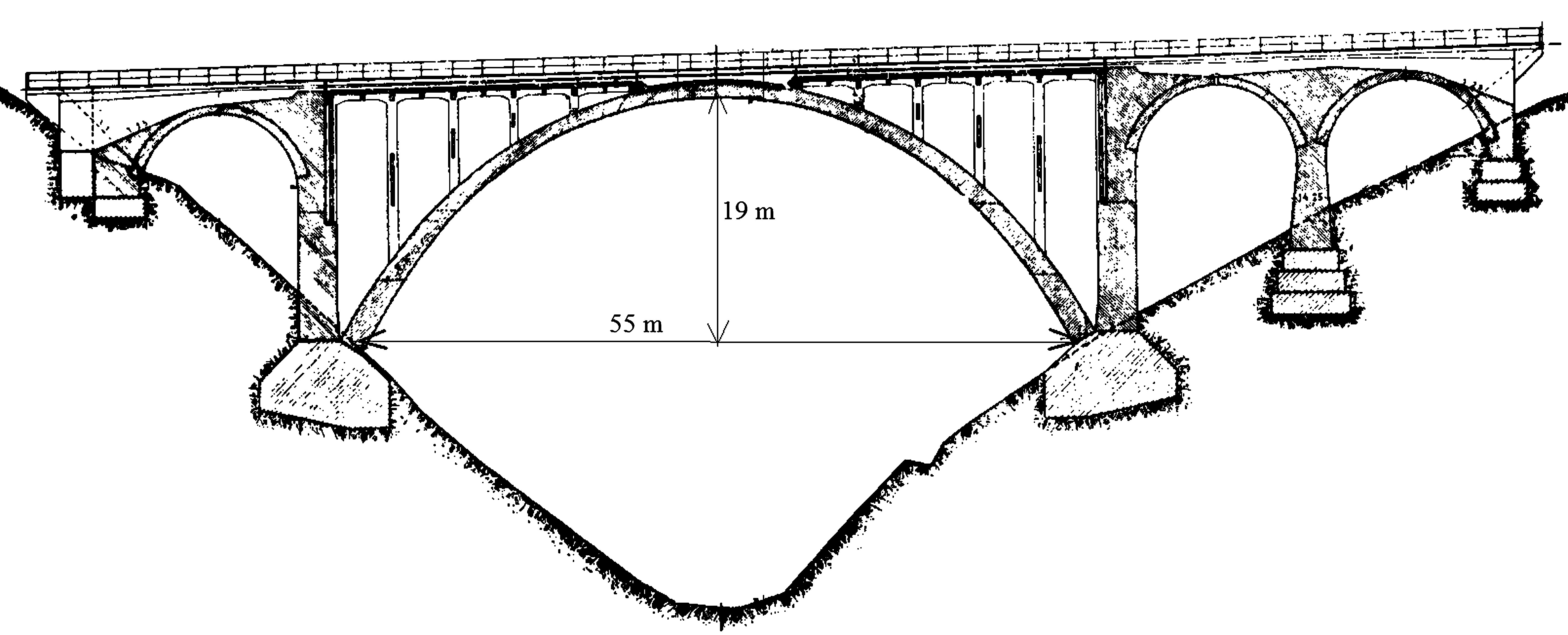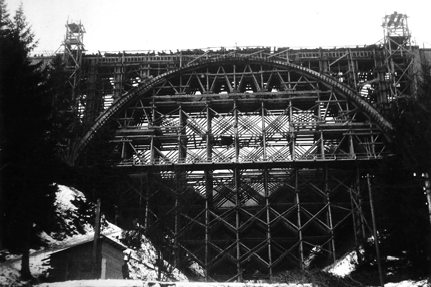 Maximálne namáhanie betónu v hlavnej klenbe sa v statickom výpočte stanovilo na 59 kg/cm2 (5,9 MPa). Na stavbu konštrukcie sa použil betón triedy E (označenie podľa normy ČSN 1230-1937). Prevodom na spoločné normy sa určila pevnostná trieda na tento druh C 10/13,5, čo sa môže pri takomto type monumentálnej stavby javiť ako veľmi malá pevnosť. Predpolia viaduktu tvoria tri oblúky, každý so svetlosťou 12 m. Rozmery týchto železobetónových klenieb sa menia, podobne ako pri hlavnej klenbe. Vo vrchole majú šírku 4,5 m a hrúbku 0,6 m. V päte dosahuje klenba hrúbku 0,9 m. Betónovanie hlavnej klenby bolo dôkladne premyslené a navrhnuté s podrobným postupom v technickej dokumentácii. Postup betónovania sa zvolil tak, aby sa eliminovali nežiaduce účinky zmrašťovania. Pri betonáži sa vynechali pracovné škáry so šírkou 50 až 100 cm. Tieto sa zabetónovali po 20 dňoch tuhnutia. Betonáž arkádového rámu sa navrhla tak, aby sa vylúčilo nerovnomerné zaťaženie oblúka. Prebiehala súbežne z oboch strán viaduktu.