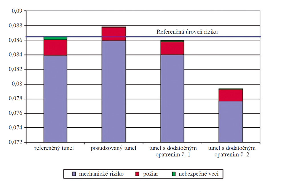 V krátkom čase po katastrofických požiaroch v alpských tuneloch sa začali diskusie na európskej úrovni s cieľom zabrániť opakovaniu podobných udalostí alebo aspoň minimalizovať ich výskyt a ich dôsledky. Vytvorili sa medzinárodné expertné skupiny, ktoré pripravili dokument schválený v roku 2004 európskou komisiou a parlamentom ako smernica č. 2004/54/EC o minimálnych bezpečnostných požiadavkách na tunely v transeurópskej cestnej sieti. Smernicu boli krajiny EÚ povinné prijať do svojej všeobecne záväznej legislatívy. Na Slovensku bola smernica implementovaná nariadením vlády č. 344/2006 Z. z. [3]. Okrem opatrení týkajúcich sa infraštruktúry rieši smernica rôzne aspekty výstavby a prevádzky tunelov vrátane spôsobu odsúhlasovania projektovej dokumentácie tunelov a jej súčastí vzťahujúcich sa na otázky bezpečnosti. V zmysle znenia smernice [1] je potrebné v predpísaných prípadoch posúdiť a preukázať bezpečnosť cestných tunelov metódou analýzy rizík. Smernica zároveň zaviazala každý členský štát EÚ, aby vyvinul metodiku na analýzu rizík na národnej úrovni. Ako jedna z prvých bola rakúskymi odborníkmi na bezpečnosť a vetranie tunelov vyvinutá metodika známa pod akronymom TuRisMo – Tunnel Risk Model, ktorá bola publikovaná v roku 2008. V roku 2010 bol rakúsky rizikový model TuRisMo adaptovaný na slovenské predpisy a okrajové podmienky a následne po schválení bola metodika publikovaná ako TP 02/2011 Analýza rizík pre slovenské cestné tunely. Základný princíp posúdenia rizík podľa slovenskej metodiky vychádza z minimálnych bezpečnostných požiadaviek na cestné tunely. Tunel, ktorý spĺňa všetky požiadavky a podmienky kladené smernicou [1], sa považuje za dostatočne bezpečný. Posúdenie bezpečnosti skúmaného tunela tvorí základ hodnotenia rizík prostredníctvom modelu definovaného v TP 02/2011 [8]. Tunel podobný skúmanému tunelu, ktorého všetky aspekty sú v úplnej zhode s požiadavkami a definíciami smernice, je definovaný ako referenčný tunel. Rizikové posúdenie sa vykoná pre oba tunely – referenčný, ako aj skutočný skúmaný tunel. Očakávaná hodnota rizika stanovená pre skúmaný tunel sa porovnáva s očakávanou hodnotou rizika referenčného tunela (ktorý spĺňa minimálne požiadavky na bezpečnosť presne v súlade so smernicou). Pri prekročení minimálnej úrovne bezpečnosti referenčného tunela musia byť odchýlky vyrovnané pomocou dodatočných bezpečnostných opatrení (obr. 4). Výsledkom analýzy rizík je očakávaná hodnota rizika pre tunel – dlhodobý štatisticky očakávaný počet obetí v tuneli za rok. Táto hodnota zodpovedá súčtu čiastkových rizík jednotlivých scenárov skúmaných v strome udalostí analýzy rizík. Čiastkové riziká vyplývajú z násobenia početnosti s priemernou štatisticky očakávanou mierou škody podľa jednotlivých scenárov.