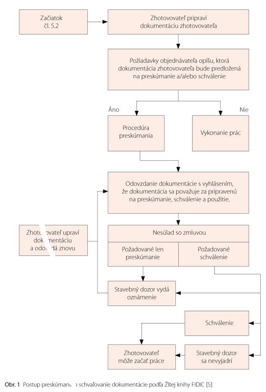 V zmysle článku 5 všeobecných zmluvných podmienok je zhotovovateľ zodpovedný za projekt, ktorý majú vypracovať kvalifikovaní projektanti, pričom zhotovovateľ ručí za ich skúsenosť a schopnosť [10]. Projektová dokumentácia zhotovovateľa sa predloží na preskúmanie a/alebo schválenie stavebnému dozoru, ktorý vydá v predpísanej lehote oznámenie zhotovovateľovi, že je dokumentácia schválená bez pripomienok, s pripomienkami alebo že nespĺňa požiadavky zmluvy a je zamietnutá (obr. 1).