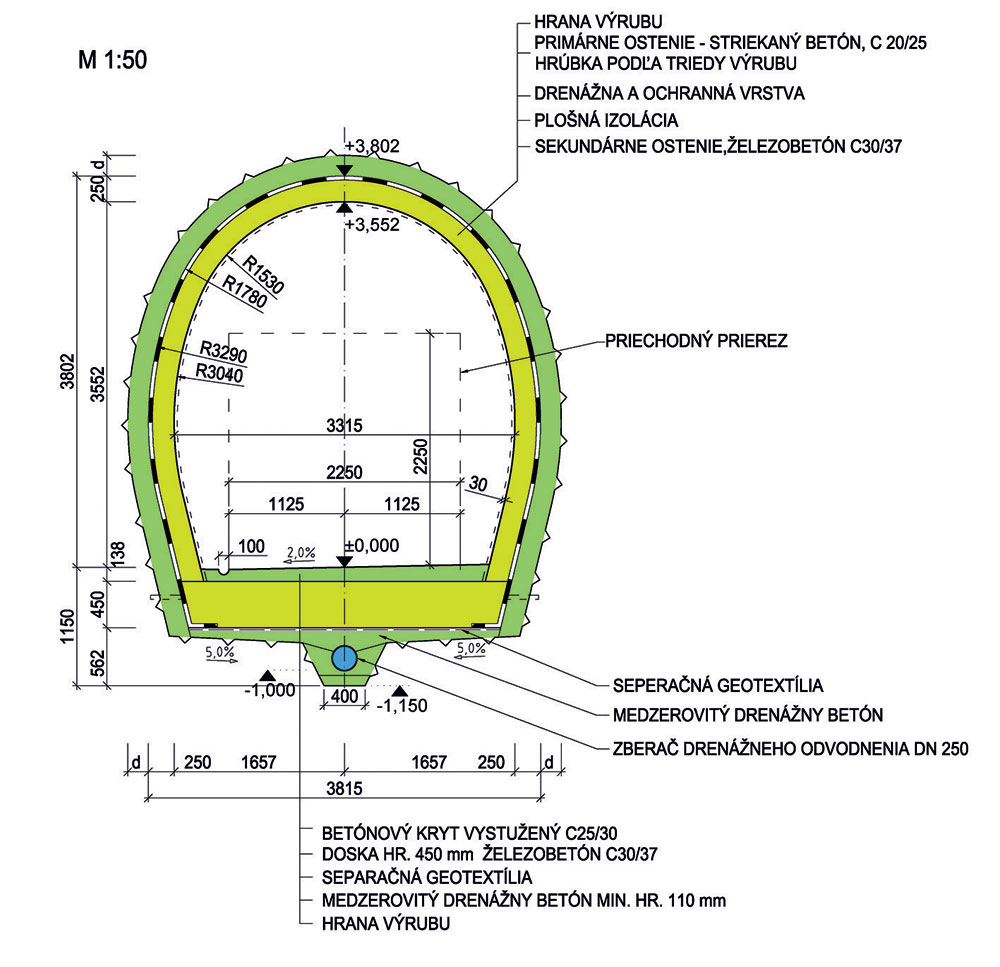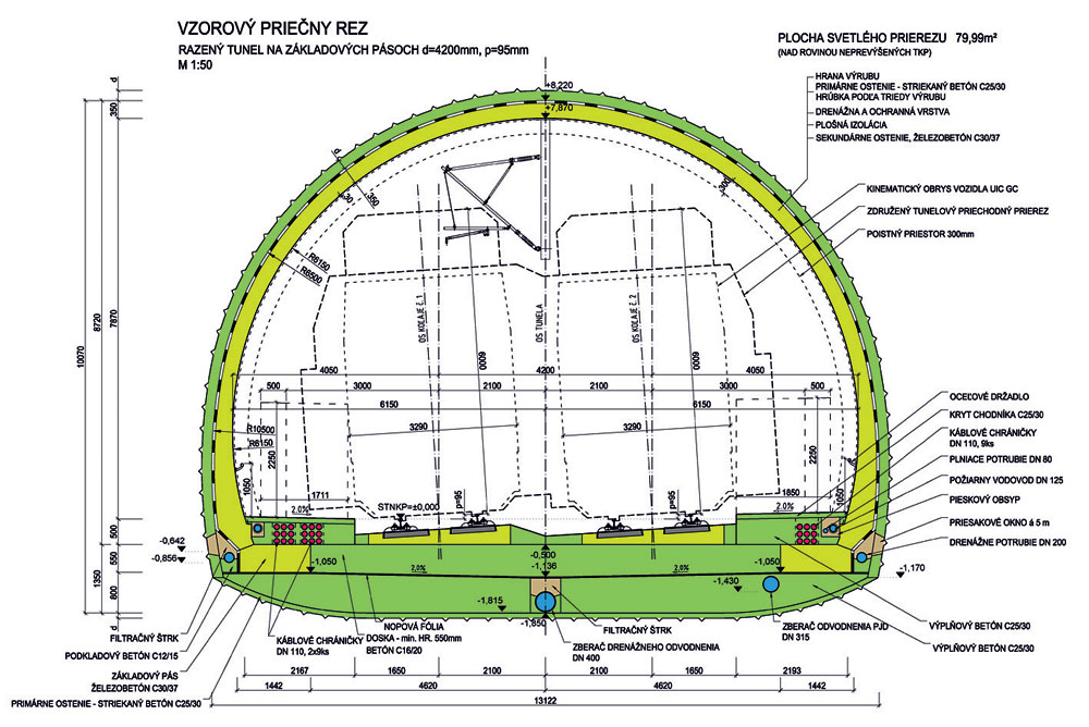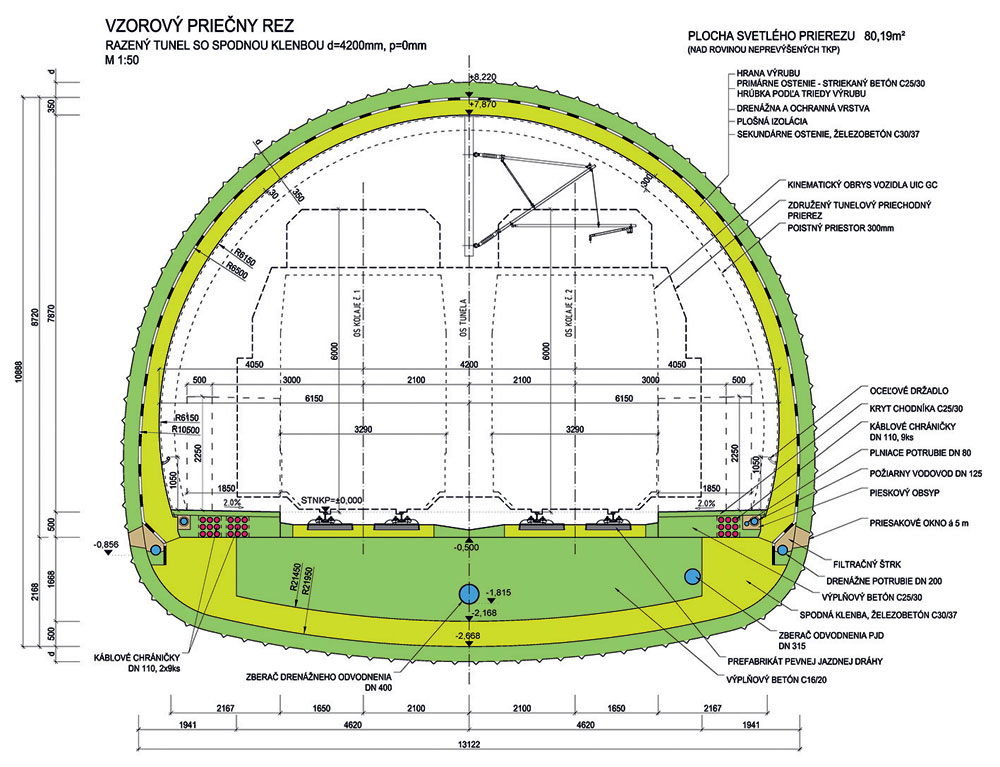 Tunel tvoria združený tunelový priechodný prierez s elektrifikačným nadstavcom a kinematickým obrysom vozidla UIC GC, obojstranné únikové cesty, poistný priestor, obojstranný bezpečnostný priestor široký 0,5 m a poistný priestor so šírkou 0,3 m. V miestach vzájomnej osovej vzdialenosti osí koľají viac ako 4 200 mm nemožno dodržať šírku bezpečnostného priestoru 500 mm, preto sa v tejto časti tunela navrhli bezpečnostné výklenky každých 20 m.