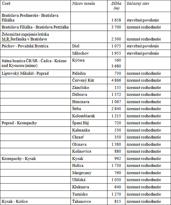 Najväčší počet železničných tunelov je navrhovaných na modernizovanej trati od Liptovského Mikulášu až po Košice. Tento celý modernizovaný úsek je rozdelený na štyri samostatné stavby.