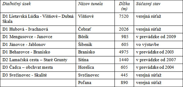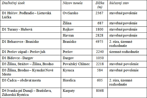 Tab.2 Tunely na diaľniciach v prevádzke, výstavbe a v prebiehajúcej verejnej súťaži