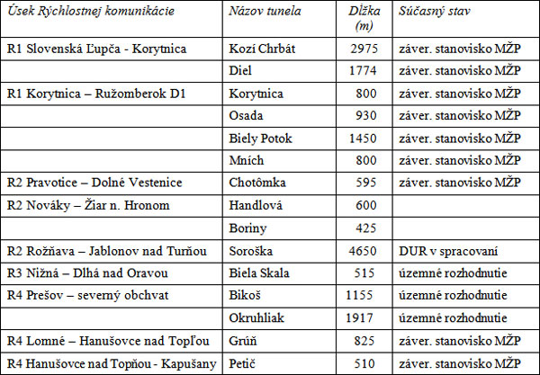 Tab.4 Pripravované cestné tunely na rýchlostných komunikáciach