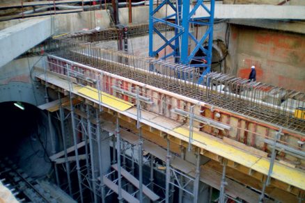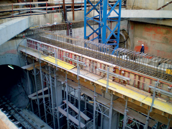 Realizované práce boli rozdelené do troch etáp – armovanie a betonáž zvislých stien, stĺpov a prievlakov, stropnej dosky. Základovú dosku už vyhotovil predošlý subdodávateľ. Naše práce v rotačnej šachte sa začali realizáciou hydroizolačného súvrstvia s napojením na jestvujúcu izoláciu. Použila sa PVC fólia s hrúbkou 2 mm a geotextília 500 g/m2. Pracovné škáry sa ošetrili napučiavacím bentonitovým pásikom a injektážnymi hadičkami pre prípadnú injektáž. Steny s výškou 7,65 m sa armovali a betónovali na tri etapy použitím jednostranného debnenia. Súčasťou podporného systému boli aj štyri stĺpy a dva prievlaky s dĺžkou 14,8 m.