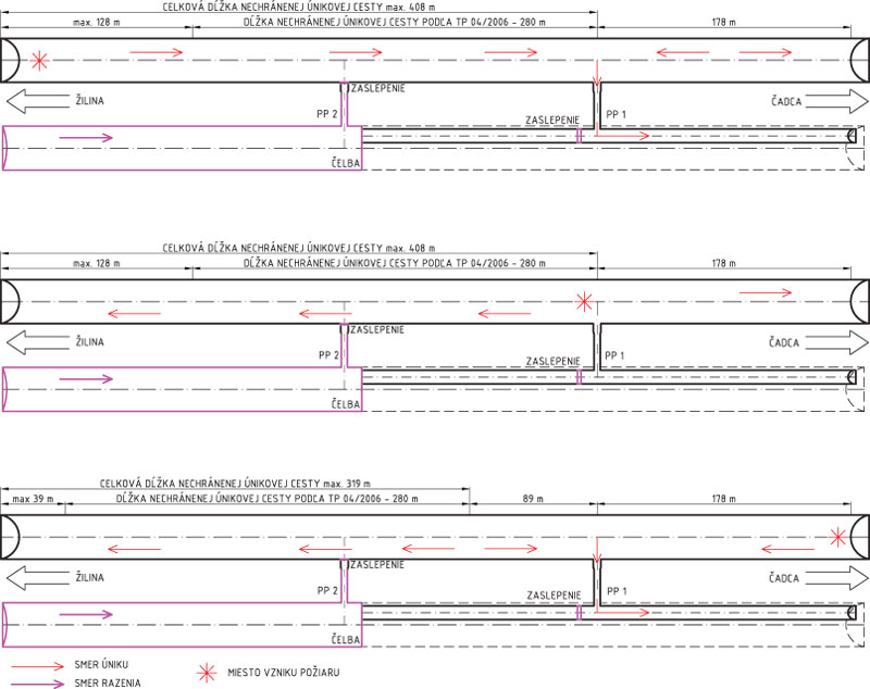 Samozáchranu ľudí v prevádzkovanej tunelovej rúre v súčasnosti zabezpečuje šesť SOS kabín a dve priečne prepojenia vo vzájomnej vzdialenosti 178 m, ktoré ústia do únikovej štôlne. Úniková štôlňa vedie od portálu Čadca približne do dvoch tretín rúry (obr. 2). Pred oboma portálmi sú vybudované nástupné plochy, na ktoré sa napájajú samostatné prístupové komunikácie pre vozidlá záchranných zložiek.