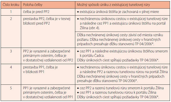 Spôsob riešenia únikovej cesty je rozdelený do piatich krokov podľa toho, kde sa predpokladá vznik incidentu (požiaru) a kde bude v tom čase čelba (tabuľka). Miesto vzniku požiaru je v každom kroku uvažované v mieste priečneho prepojenia (PP) – pred PP2, medzi PP2 a PP1 a za PP1.